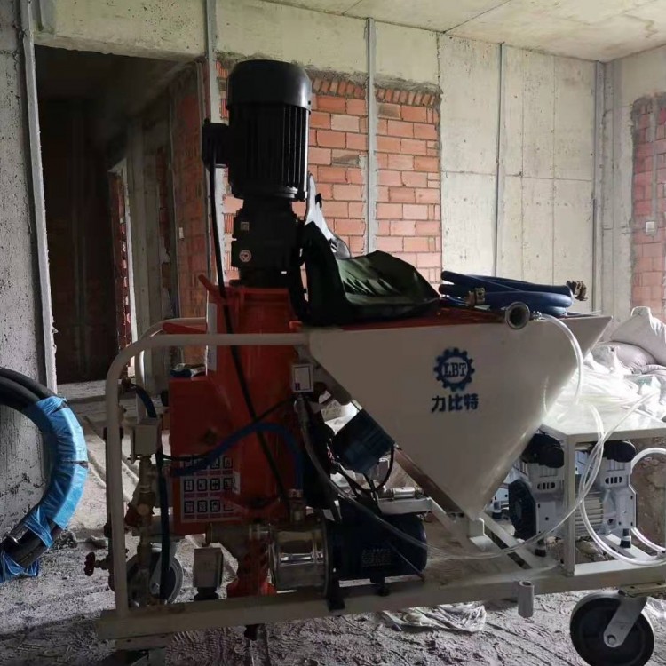 整台喷涂机在施工时只需三个人,即一人输送原料,一人控制喷喷料,另一个人做协助工作(如:协助移动皮管),而材料的加水,搅拌,输送等过程都是由机器自动完成。与传统的人工施工相比节省了人力、物力、财力和宝贵的时间,并且在施工质量上也比传统的人工施工更好,更有保证。工作原理,搅拌好的物料由配送搅拌机卸口(或人工拌料和上料),经过震动筛网供给给喷涂机料斗中,由螺旋送料锟送给高压室,再由高压转子、高压定子旋转形成高压,把水泥砂浆经过高压输送管送到喷头里,由喷头引入另一股高压风,把物料吹散、加速喷射出去。