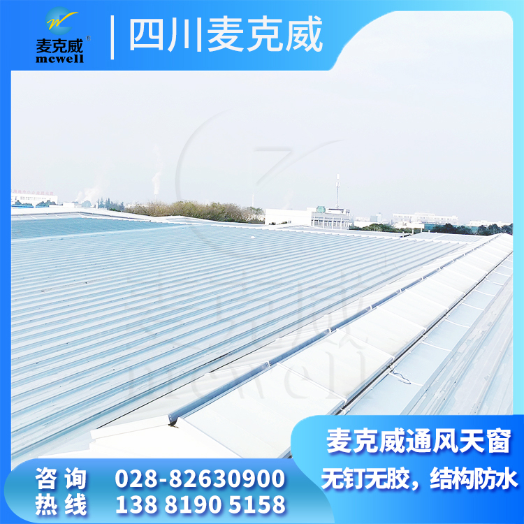 四川麦克威三角型电动采光排烟天窗根据喉口尺寸可分为1200mm、1500mm、2000mm等不同规格,其产品长度,宽度,高度可根据图集、甲方及设计要求制作。三角型电动采光排烟天窗的无钉无胶、结构防水技术特点:1.窗扇不打钉、不打胶,依靠结构构造防水,摒弃传统打钉固定、硅胶粘接防水的方法,消除了渗漏隐患;2.天窗美观大方、结构强度高。