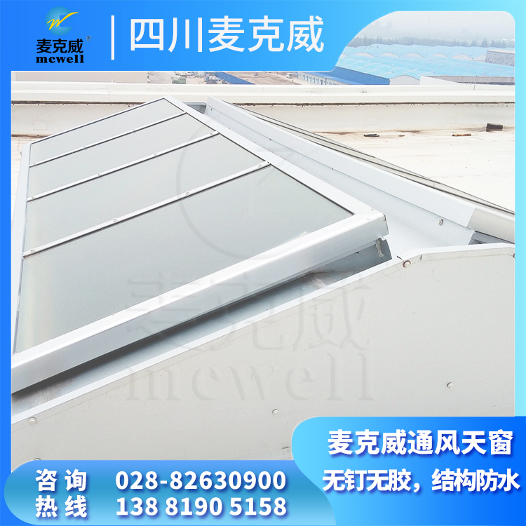 四川麦克威三角型电动采光排烟天窗根据喉口尺寸可分为1200mm、1500mm、2000mm等不同规格,其产品长度,宽度,高度可根据图集、甲方及设计要求制作。三角型电动采光排烟天窗的无钉无胶、结构防水技术特点:1.窗扇不打钉、不打胶,依靠结构构造防水,摒弃传统打钉固定、硅胶粘接防水的方法,消除了渗漏隐患;2.天窗美观大方、结构强度高。