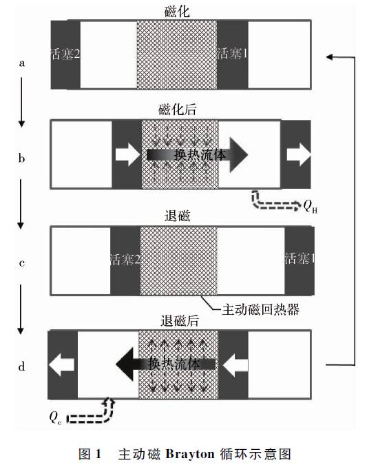 在变化磁场中某些磁性材料存在励磁放热、去磁吸热的特性,这种特性被称为磁热效应。通常磁热效应有两种表征参数,绝热温变ΔTad与等温磁熵变ΔSM。磁制冷循环是基于材料的磁热物性来实现的。类似于蒸汽压缩式制冷循环,拥有磁热效应的工质在低温环境下去磁吸收热量,并在高温环境下磁化释放热量,从而形成了一个完整的制冷循环。主动磁制冷循环是磁制冷中重要的应用循环之一,由主动磁回热器(Active Magnetic Regenerator,缩写AMR)与基本磁制冷循环构成,如两个等磁场过程和两个等熵过程构成的主动磁Brayton循环,循环运行过程如图1所示。小型室温磁制冷系统由同心Halbach永磁体组、主动磁回热器、高低温换热器及换热流体、驱动控制与采集系统等组成。