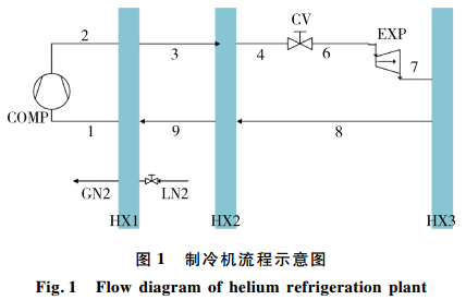 研究的系统流程简图在图1中给出。该流程采用液氮预冷,一个制冷级含有一台透平膨胀机和节流阀,这里节流阀的安装是必须的,首先可以在变工况的情况下调节进入膨胀机的工质流量以控制膨胀机的叶轮转速,从而使系统稳定运行;其次是可以通过调节阀门的开度来调节膨胀机的进口压力,从而可以很好地适应系统有无液氮预冷的工况。