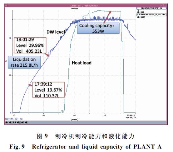 经过测试,当有液氮预冷时测试制冷能力为553 W,液化率215.8 L/h,如图9所示,达到初图9制冷机制冷能力和液化能力的验收指标。改造后效果良好,目前制冷机运行稳定。