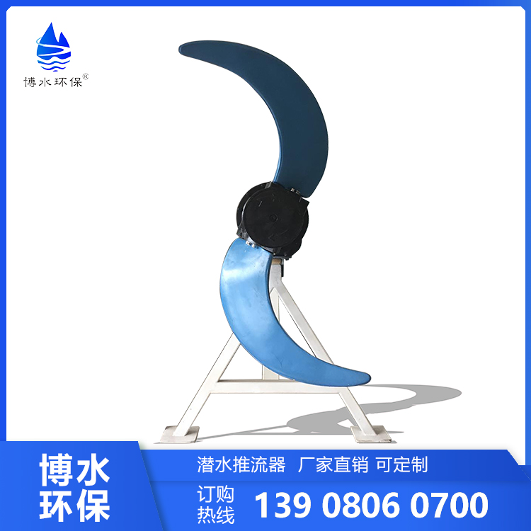潜水搅拌机又称污水处理搅拌机或潜水搅拌器,是种主要用于污水处理的 搅拌机械,由港水电机、密封机构、叶轮(又称转轮)、电气控制等组成,通常利用 导杆安装在水下。潜水搅拌机叶轮在电机的驱动下旋转,搅拌液体产生旋向时流, 利用沿着射流表面的剪切应力进行混合,使射流以外的液体通过摩擦产生搅拌作用,在极度混合的同时,形成体积流,应用大体积流动模式得到受控液体的搅拌推流输送,达到充分混合、防止沉淀及推流的作用。搅拌的效果取决于液体的密度和黏度、水池的体积和形状以及潜水搅拌机的功率和效率。当水池较大时,需要使用两台或两台以上的潜水搅拌机。