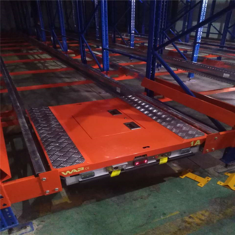 1、 存货:由叉车将货物放在货架巷道导轨的较前端,通过无线电操作的WAP-1穿梭车,可以承载托盘货物在导轨上运行;