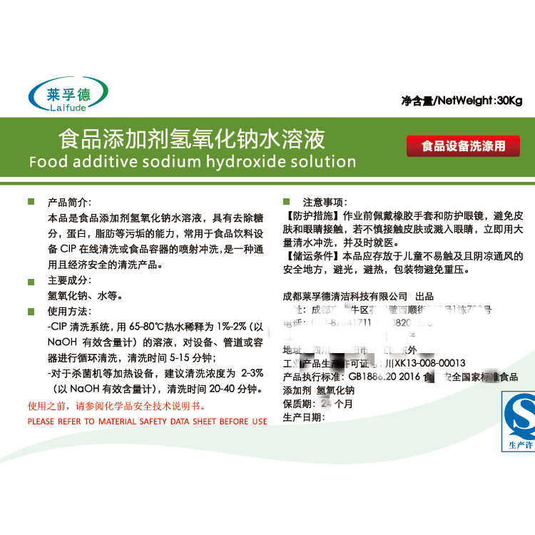 本品是食品添加剂氢氧化钠水溶液,具有去除糖分,蛋白,脂肪等污垢的能力,常用于食品饮料设备CIP在线清洗或食品容器的喷射冲洗,是一种通用且经济安全的清洗产品。