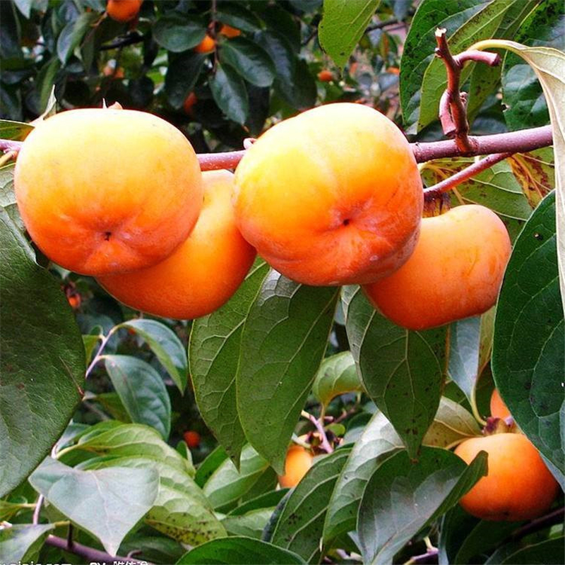 落叶乔木,一般1-2年生柿树称柿子苗,高达1-2米。树冠直,树皮灰色,冬芽先端钝,小枝无。叶阔椭圆形,表面深绿色、有光泽,革质,入秋部分叶变红,叶痕大、红棕色,维管束痕呈凹入状。花雌雄异株或杂性同株,单生或聚 生于新生枝条的叶腋中,花黄白色。果形因品种而异,橙黄或红色,萼片宿存大,先端钝圆。花期5~6月,果熟期9~11月。柿已有300年栽培历史,其栽培品种约有900个以上,都是作为果树栽培的。在绿化造林中也作为观果树和色叶树应用。