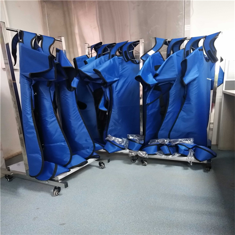 一般铅防护服的防护当量为0.1mmpb—0.5mmpb,常见的0.35mmpb当量的铅防护服比较重,一件长袖防护服大约有4-6kg。铅防护服的使用寿命一般为5-8年,存放时要注意不能折叠,否则容易造成折角部分破损而影响防护效果。