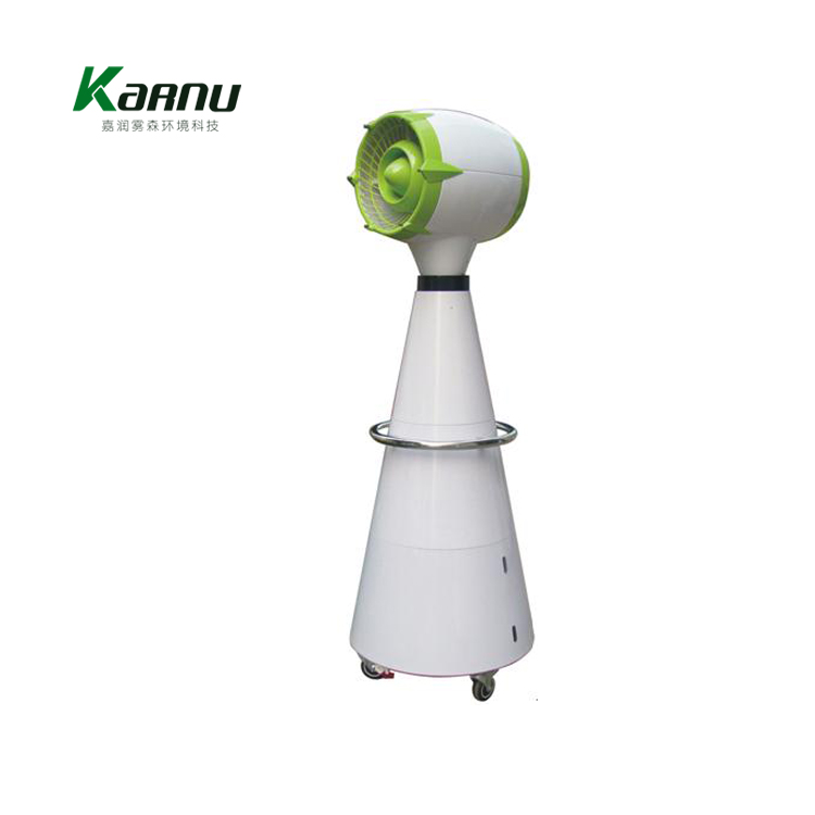 降温喷雾风扇 水在高压水泵的作用下,拥有几十公斤的压力,通过高压喷嘴产生微雾,雾滴直径小于10微米。因此蒸发表面积大大提高。微雾通过强力风扇吹出的气流,极大的提高了液体表面风速,加快了气体分子的扩散,此水的蒸发量大大提高,水在蒸发过程中吸收热量,降低温度。同时可以提高空气相对湿度,减少粉尘,净化空气;这种风扇是通过高压利用喷嘴产生微雾,故称做降温喷雾风扇,俗称降温风扇。