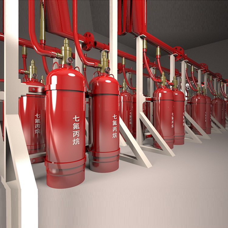 有管网七氟丙烷灭火系统的气体灭火剂储存瓶平时放置在专用钢瓶间内,通过管网连接,在火灾发生时,将灭火剂由钢瓶间,输送到需要灭火的防护区内,通过喷头进行喷放灭火。
