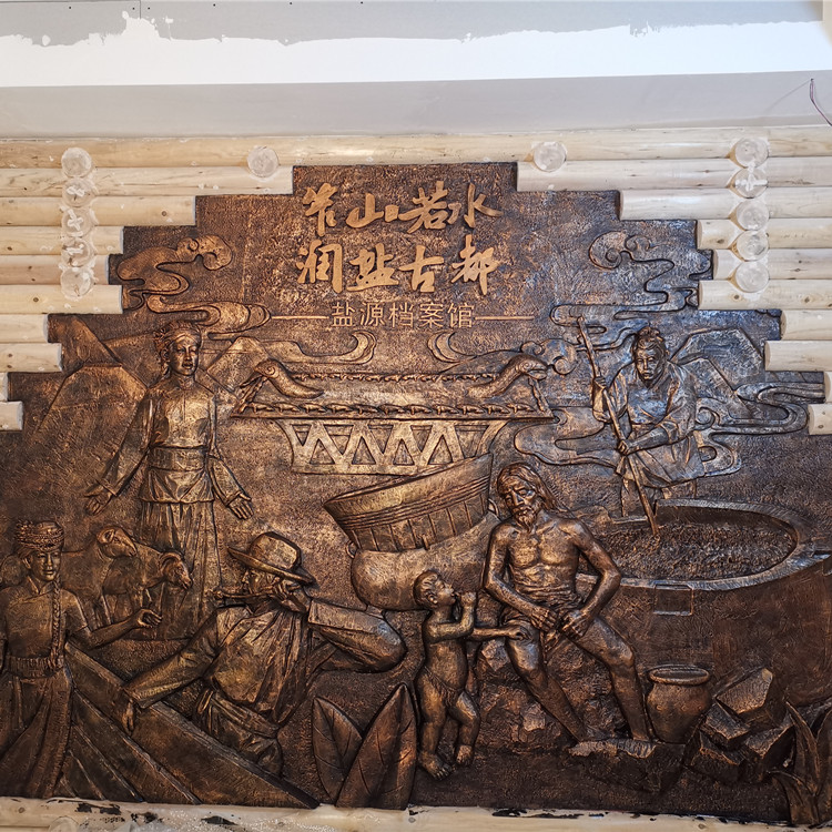 5、在硫酸钙(CaSO4)内部刷树脂和玻璃纤维为,反复涂刷三遍,晾晒干透6、整体打磨组装完成玻璃钢制作,再次对玻璃钢进行打磨接口,到符合工程要求7:利用NaOH。对表面进行清洗,表面着色,丙烯材料调制古铜底色,表面均匀涂抹覆盖玻璃钢原来颜色,晾晒晒干,在用古铜金粉手工绘制铜的效果