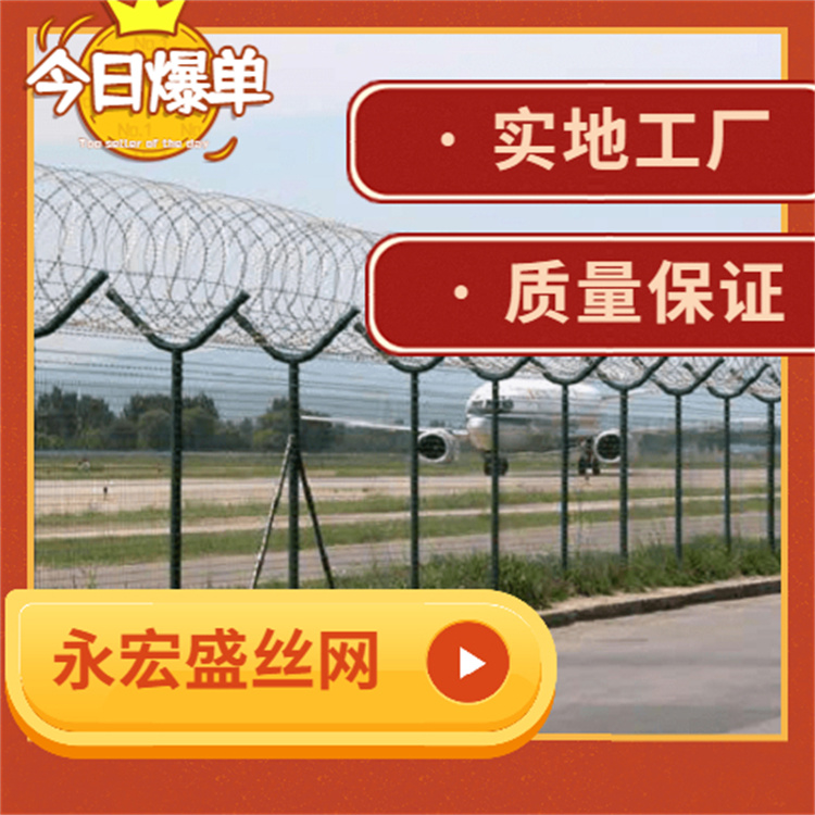 机场护栏网又称作“Y型安全防御护网”,是由V型支架立柱加强型焊接片网,安全防盗连接件和热镀锌刀片刺网组成强度和安全防御性级别很高。被广泛应用在机场,军事基地等高安全场所。